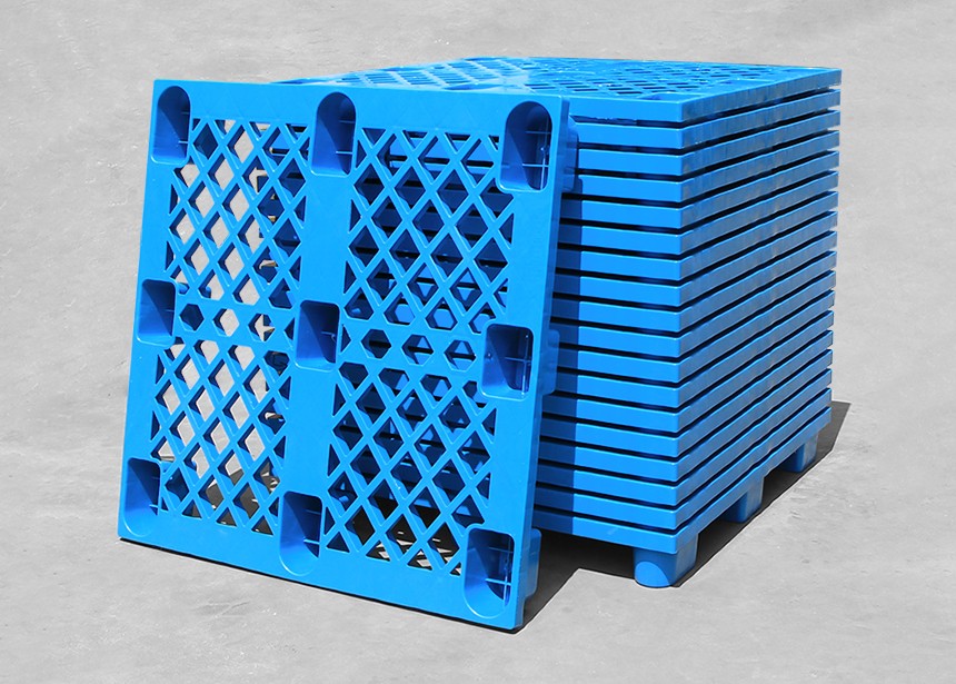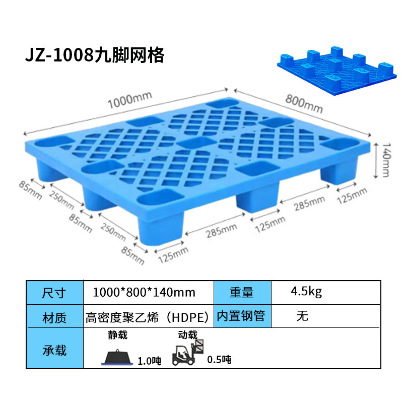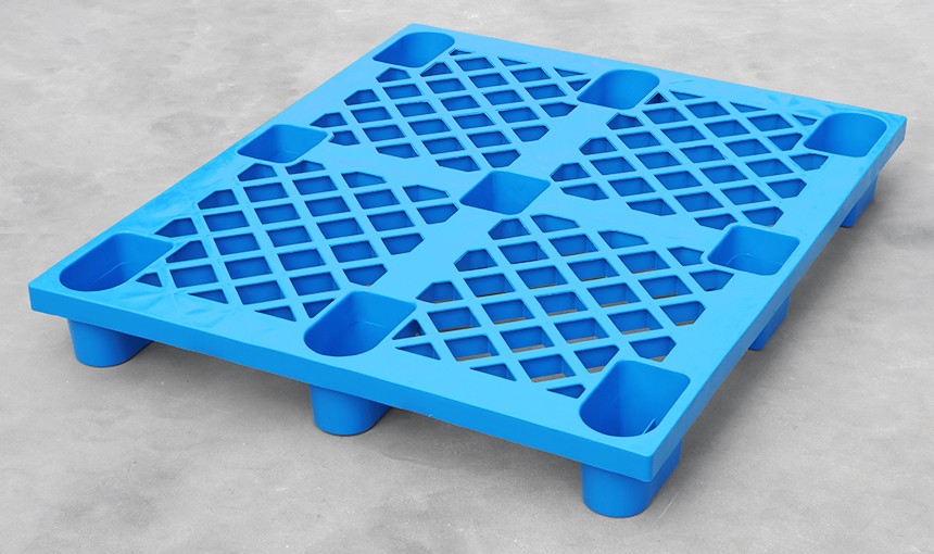 九腳網格塑料托盤的九腳網格托盤其底部是有‘九個腿’組成的,表面為‘網格’狀,顧行業為方便稱其為九腳網格托盤,九腳網格托盤大多型號的都為輕型的塑料托盤,不易用于上貨架或者較重貨物的周轉使用,大多情況下九腳網格塑料托盤都是用來倉庫貨物墊倉板防潮使用,對于輕型貨物的周轉也可。