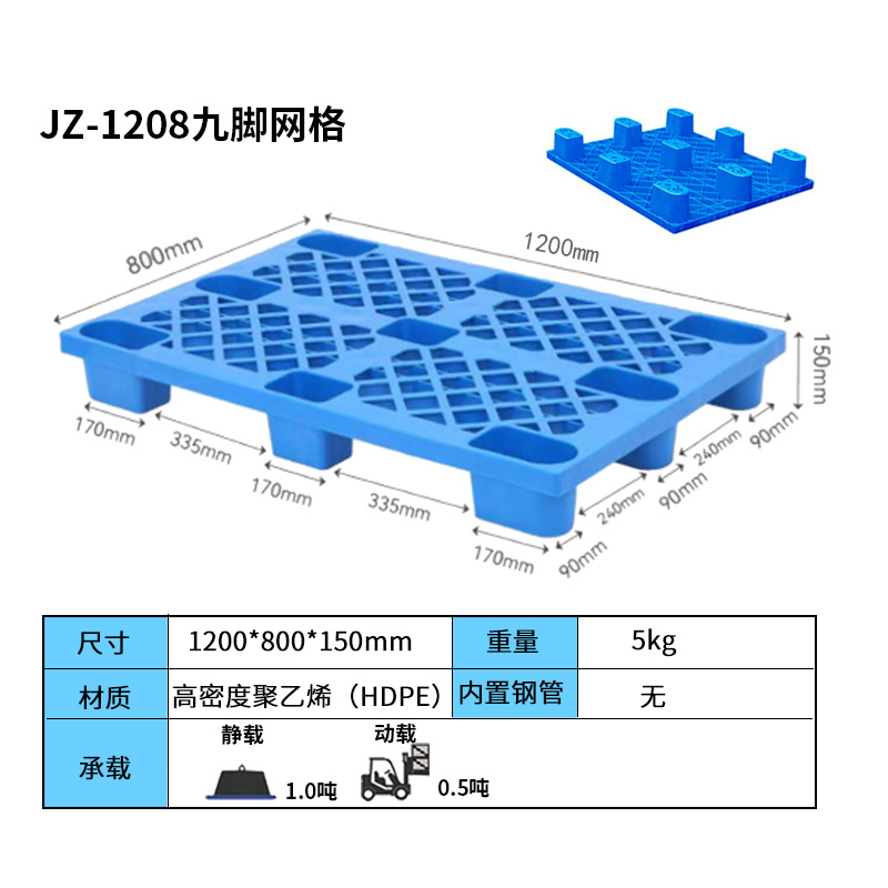 九腳網格塑料托盤的九腳網格托盤其底部是有‘九個腿’組成的,表面為‘網格’狀,顧行業為方便稱其為九腳網格托盤,九腳網格托盤大多型號的都為輕型的塑料托盤,不易用于上貨架或者較重貨物的周轉使用,大多情況下九腳網格塑料托盤都是用來倉庫貨物墊倉板防潮使用,對于輕型貨物的周轉也可。