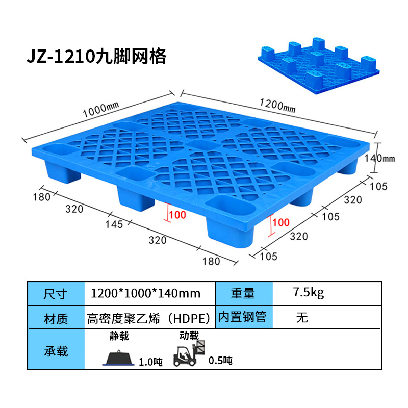 九腳網格塑料托盤的九腳網格托盤其底部是有‘九個腿’組成的,表面為‘網格’狀,顧行業為方便稱其為九腳網格托盤,九腳網格托盤大多型號的都為輕型的塑料托盤,不易用于上貨架或者較重貨物的周轉使用,大多情況下九腳網格塑料托盤都是用來倉庫貨物墊倉板防潮使用,對于輕型貨物的周轉也可。