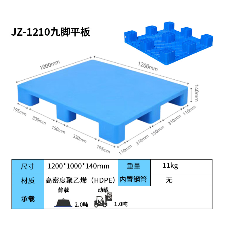 九腳平板塑料托盤底部為“九腳形”設計的塑料搬運制品,其表面為平面,廣泛應用于紡織廠、食品廠、醫藥廠等企業。這種托盤的設計特點包括輕質、平穩、美觀,無釘無刺,無毒無味,耐酸堿,不腐爛,不易被細菌繁殖,易清洗消毒,不助燃,無靜電,無火花,防暴,防滑溜,回收價值高。與鋼托盤、木托盤相比,九腳平板塑料托盤具有更好的環保性和安全性,能夠提升企業形象,提高物流效率。此外,九腳平板塑料托盤因其表面為平板狀,不易積累灰塵,方便清洗;受力均勻,對貨物有很好的保護作用;平面上均留有排氣小孔,具有良好的透氣性和防潮效果。這種托盤主要應用于倉庫輕型貨物墊倉板、叉車周轉較輕貨物使用,不適合于上貨架或者轉載大重量的貨物?