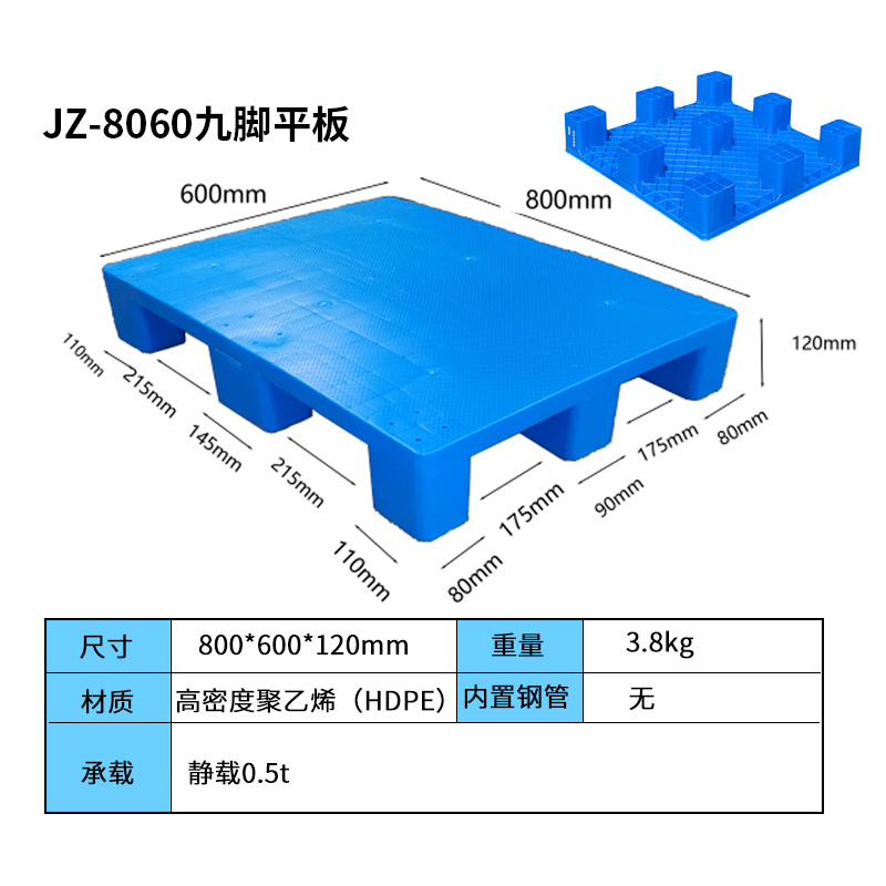 九腳平板塑料托盤底部為“九腳形”設(shè)計的塑料搬運制品,其表面為平面,廣泛應(yīng)用于紡織廠、食品廠、醫(yī)藥廠等企業(yè)。這種托盤的設(shè)計特點包括輕質(zhì)、平穩(wěn)、美觀,無釘無刺,無毒無味,耐酸堿,不腐爛,不易被細菌繁殖,易清洗消毒,不助燃,無靜電,無火花,防暴,防滑溜,回收價值高。與鋼托盤、木托盤相比,九腳平板塑料托盤具有更好的環(huán)保性和安全性,能夠提升企業(yè)形象,提高物流效率。此外,九腳平板塑料托盤因其表面為平板狀,不易積累灰塵,方便清洗;受力均勻,對貨物有很好的保護作用;平面上均留有排氣小孔,具有良好的透氣性和防潮效果。這種托盤主要應(yīng)用于倉庫輕型貨物墊倉板、叉車周轉(zhuǎn)較輕貨物使用,不適合于上貨架或者轉(zhuǎn)載大重量的貨物?