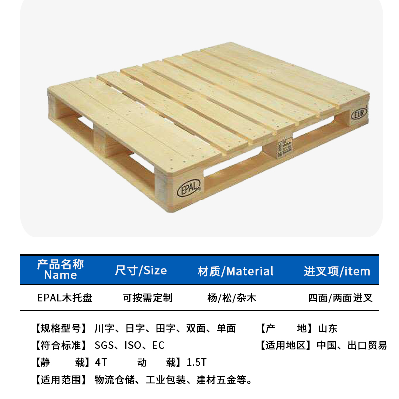 1.歐洲標準托盤(Pallet EUR1,尺寸標準:1200mm×800mm×144mm)為常用型號,主要使用國為歐洲大陸、德、法等。設計大靜載6000KG,大動載2000KG,為四面進叉。