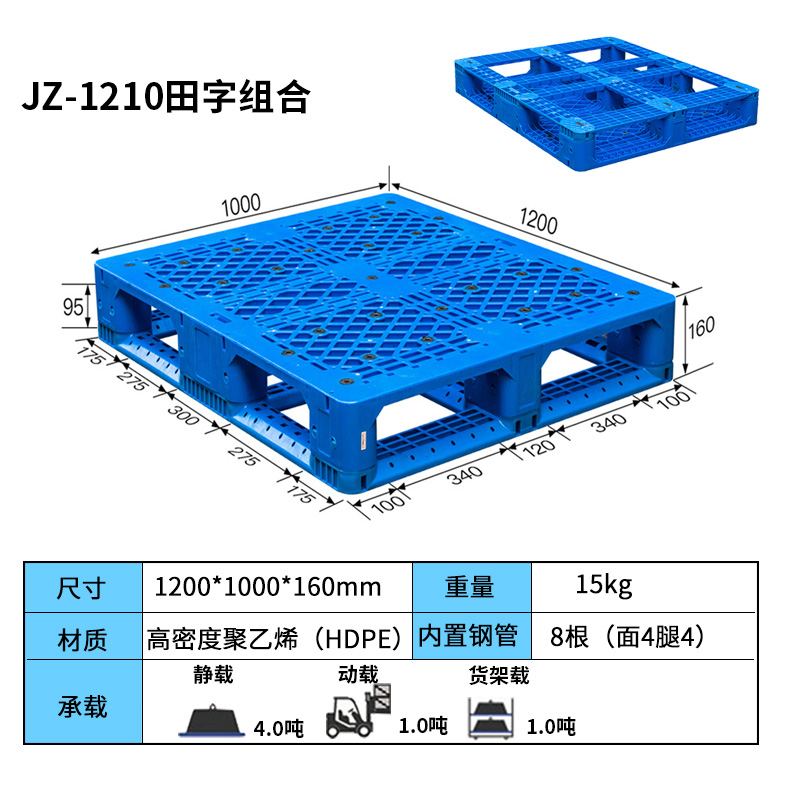 1210田字組合款塑料托盤,可上立體庫貨架,內(nèi)置芯片槽設(shè)計 田字設(shè)計,雙層加強受力,增加托盤受力強度,使受力更加均勻,結(jié)構(gòu)牢固,不易變形。完美無障礙平地堆碼,疊放易于整理存放,也可節(jié)約存儲空間,符合空間資源合理配置要求。可四向進叉,操作方便,多