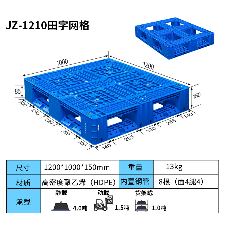田字設計,雙層加強受力,增加托盤受力強度,使受力更加均勻,結構牢固,不易變形。完美無障礙平地堆碼,疊放易于整理存放,也可節(jié)約存儲空間,符合空間資源合理配置要求。可四向進叉,操作方便,多面進叉可防止托盤變形,增加使用壽命網(wǎng)格表面在產(chǎn)品置放部位安裝防滑塊,提高產(chǎn)品使