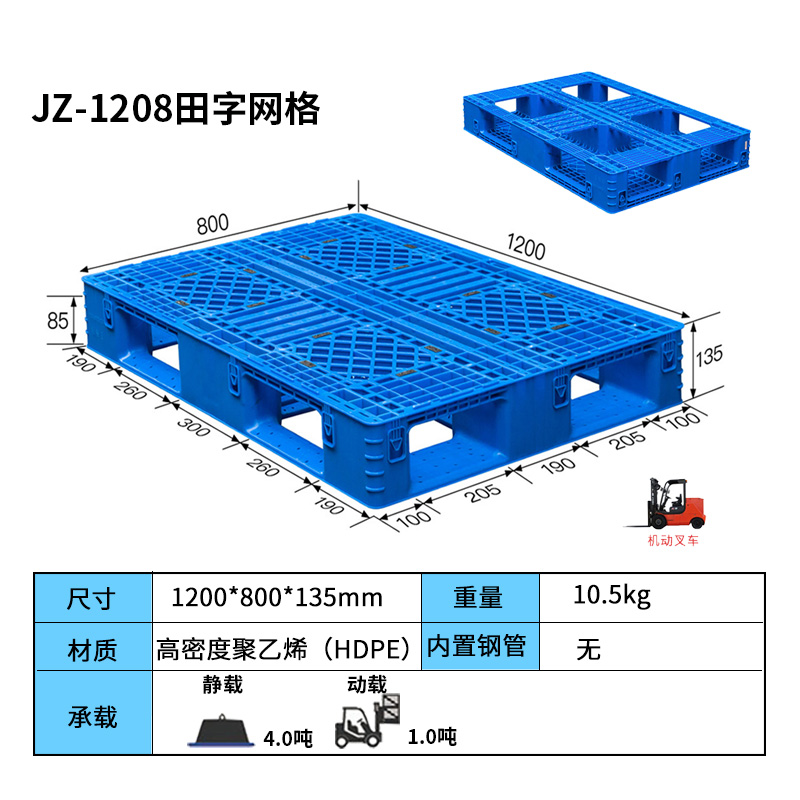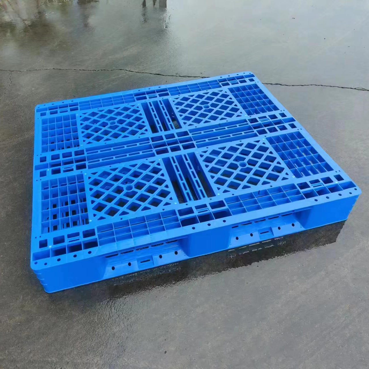 田字設計,雙層加強受力,增加托盤受力強度,使受力更加均勻,結構牢固,不易變形。完美無障礙平地堆碼,疊放易于整理存放,也可節約存儲空間,符合空間資源合理配置要求。可四向進叉,操作方便,多面進叉可防止托盤變形,增加使用壽命網格表面在產品置放部位安裝防滑塊,提高產品使