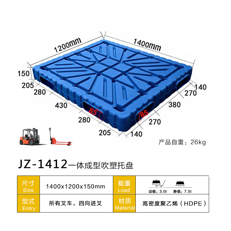 雙面吹塑托盤采用吹塑成型工藝,通常需要使用大型的中空成型機進行生產。這種托盤的設計允許其正反兩面均可使用,因此被稱為雙面塑料托盤。雙面吹塑塑料托盤的優點包括承載能力強、使用壽命長,這得益于其內部設計了X軸向緯筋、Y軸向縱筋、Z軸向豎筋,以及內部至少包含兩個支撐架,面板的兩頭向內折回,從而增強了其承載強度。此外,雙面吹塑塑料托盤可以四面進叉,每個側面設計了兩個跑道型的通孔,使得塑料托盤上下面板結構設計相同,結合在一起完成了雙面的運用。這種托盤的支撐架橫截面設計為半框形,既在強度合理的前提下減少了自身的重量,又在使用時沒有局限性,實現了高效率的自動化生產,且成本較低。雙面吹塑塑料托盤完全不添加金屬材質,塑料托盤廠家可以回收再利用,符合環保要求?